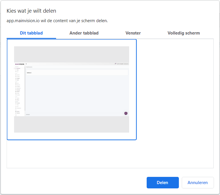 Als je op de knop Maak video klikt opent er een pop-up, hierin kun je aangeven welke inhoud je wilt delen.