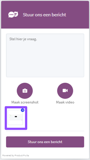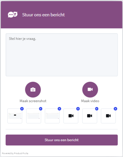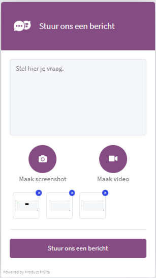 Typ in het tekst veld je vraag of opmerking. Je kunt je bericht verduidelijken door één of meer screenshot(s) of video(s) toe te voegen, maar dat is niet noodzakelijk om een bericht te sturen.