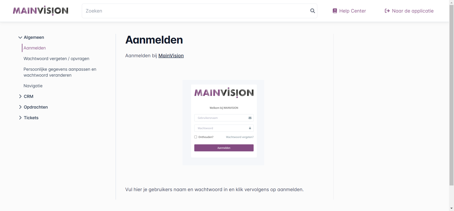 In het Helpcenter kun je informatie opzoeken over de functies, de bediening en het gebruik van MainVision.