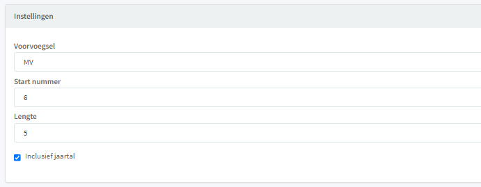 - Als "Inclusief jaartal" is aangevinkt wordt achter het voorvoegsel automatisch het kalenderjaar vermeld.