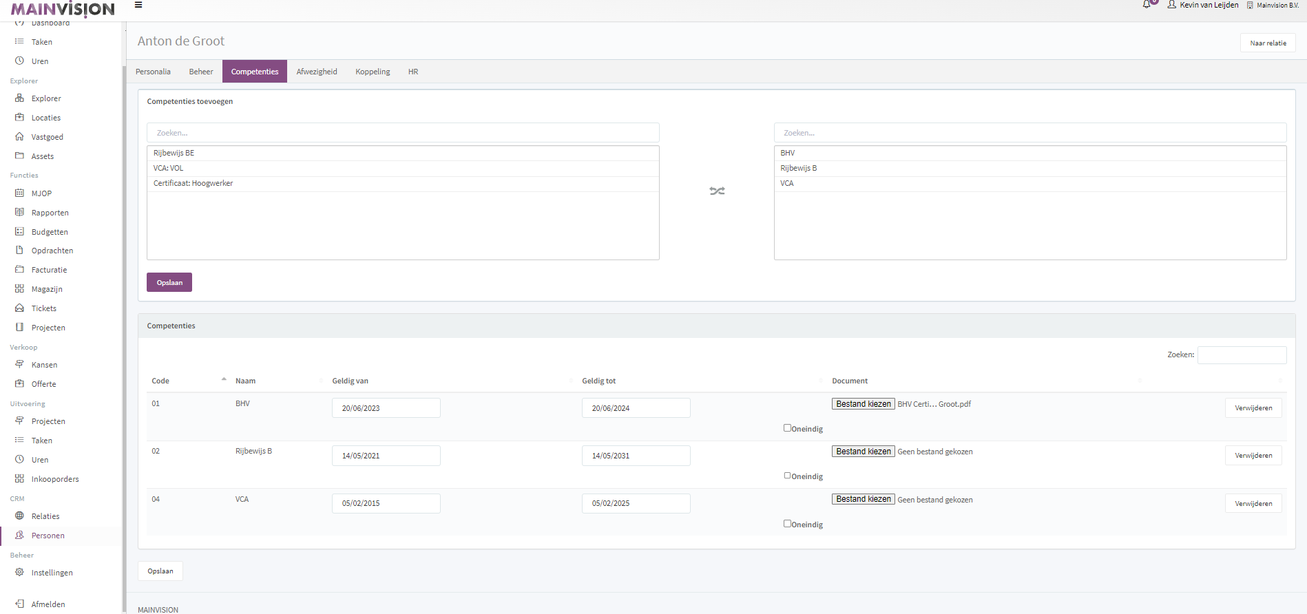 In het blok "Competenties" zie je de details van de competenties die aan deze persoon zijn toegekend, zoals de ingangs- en eventuele einddatum en eventueel een digitale kopie van een certificaat of bewijs van deze competentie.