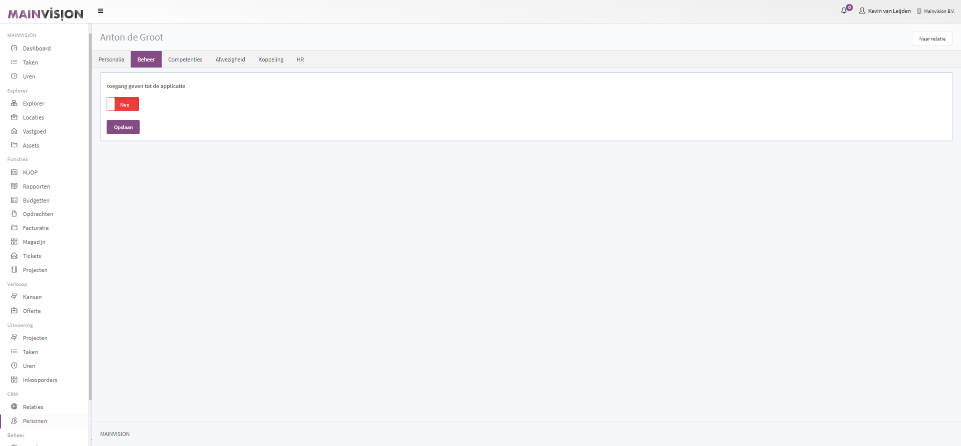 Om de toegangsrechten van een persoon in te trekken klik je bij "Toegang geven tot de applicatie" op de selectieschakelaar om deze op Nee te zetten.