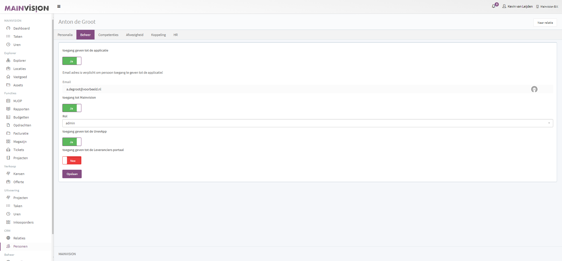 Om te bepalen of een persoon toegang heeft tot de applicatie en welke functies deze persoon dan kan gebruiken stel je de toegangsrechten in bij Beheer.
