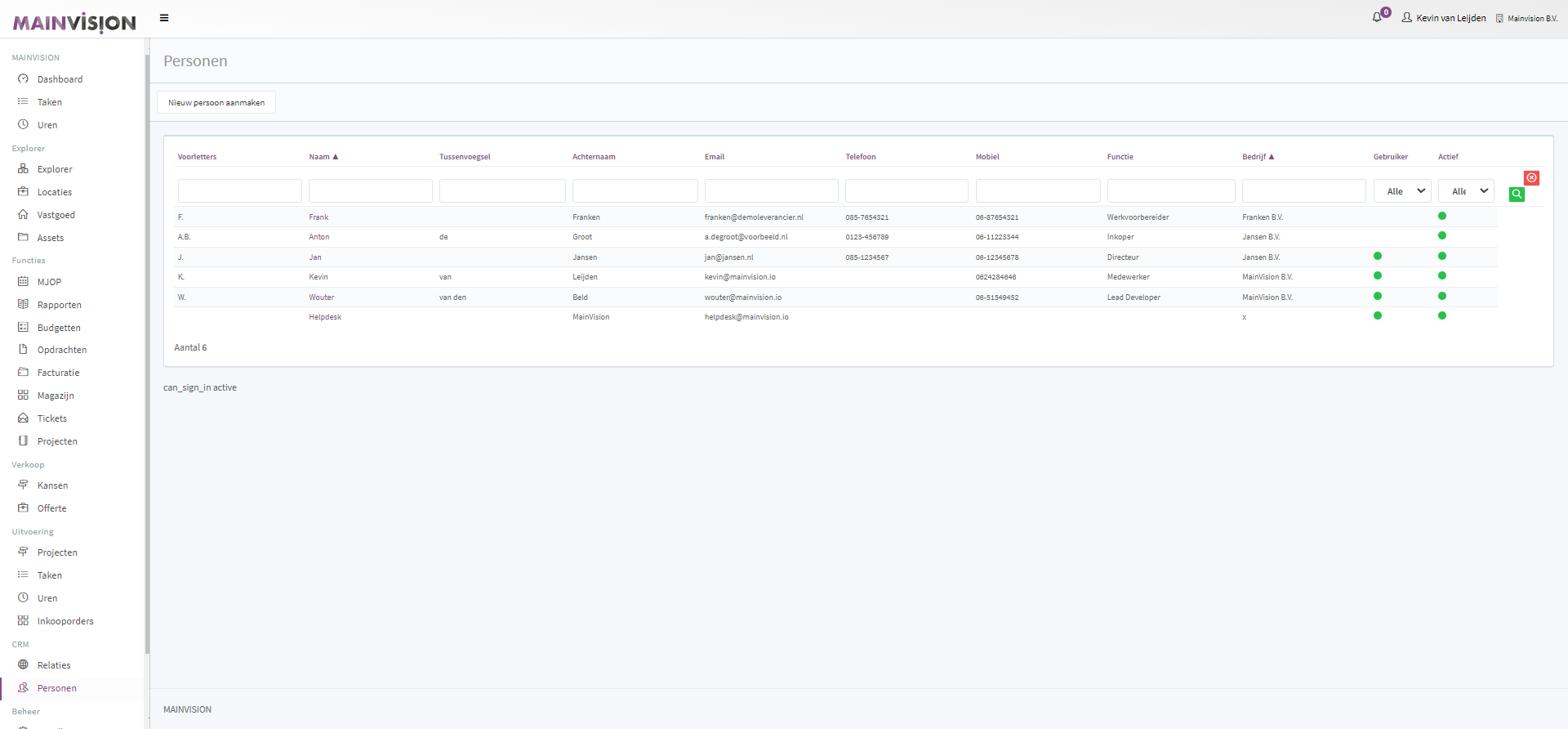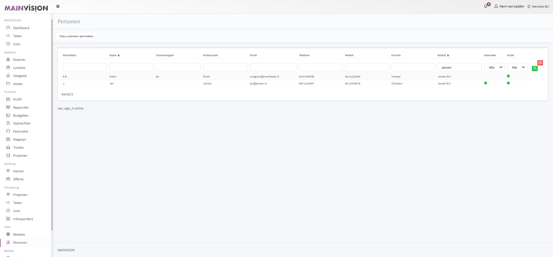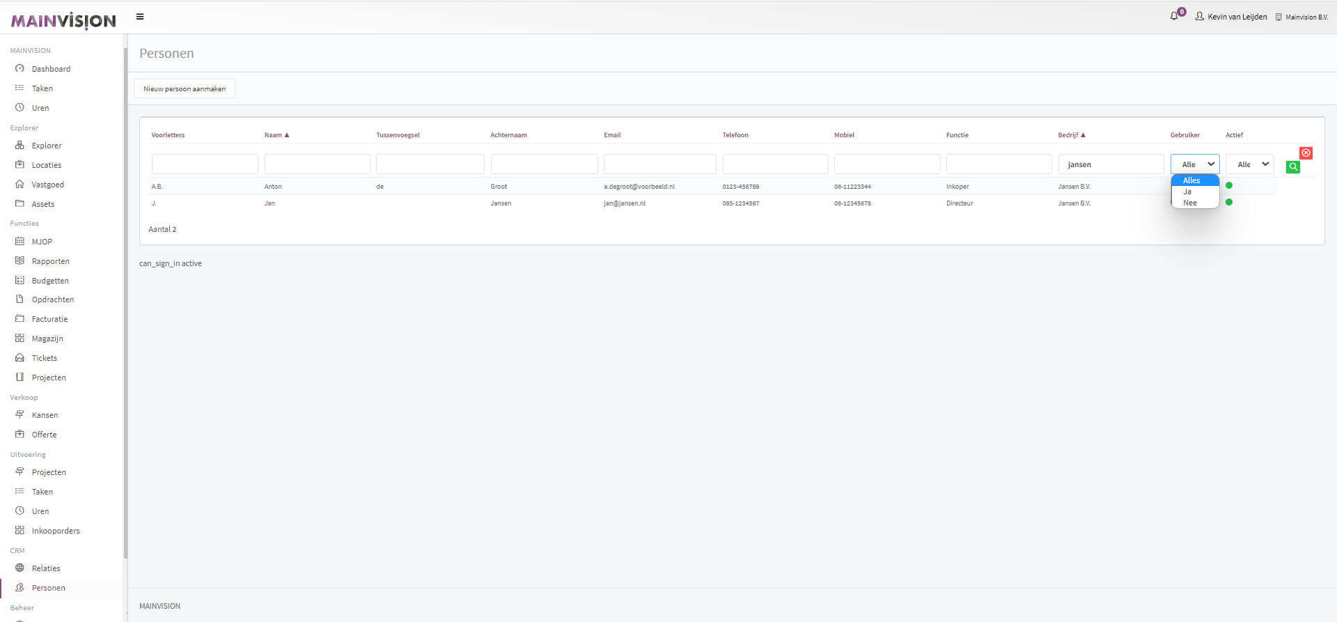 Standaard worden de personen weergegeven die actief zijn.