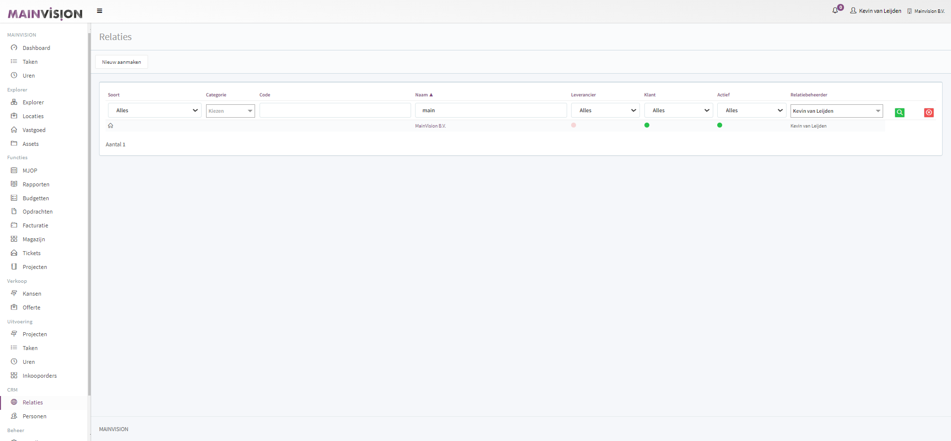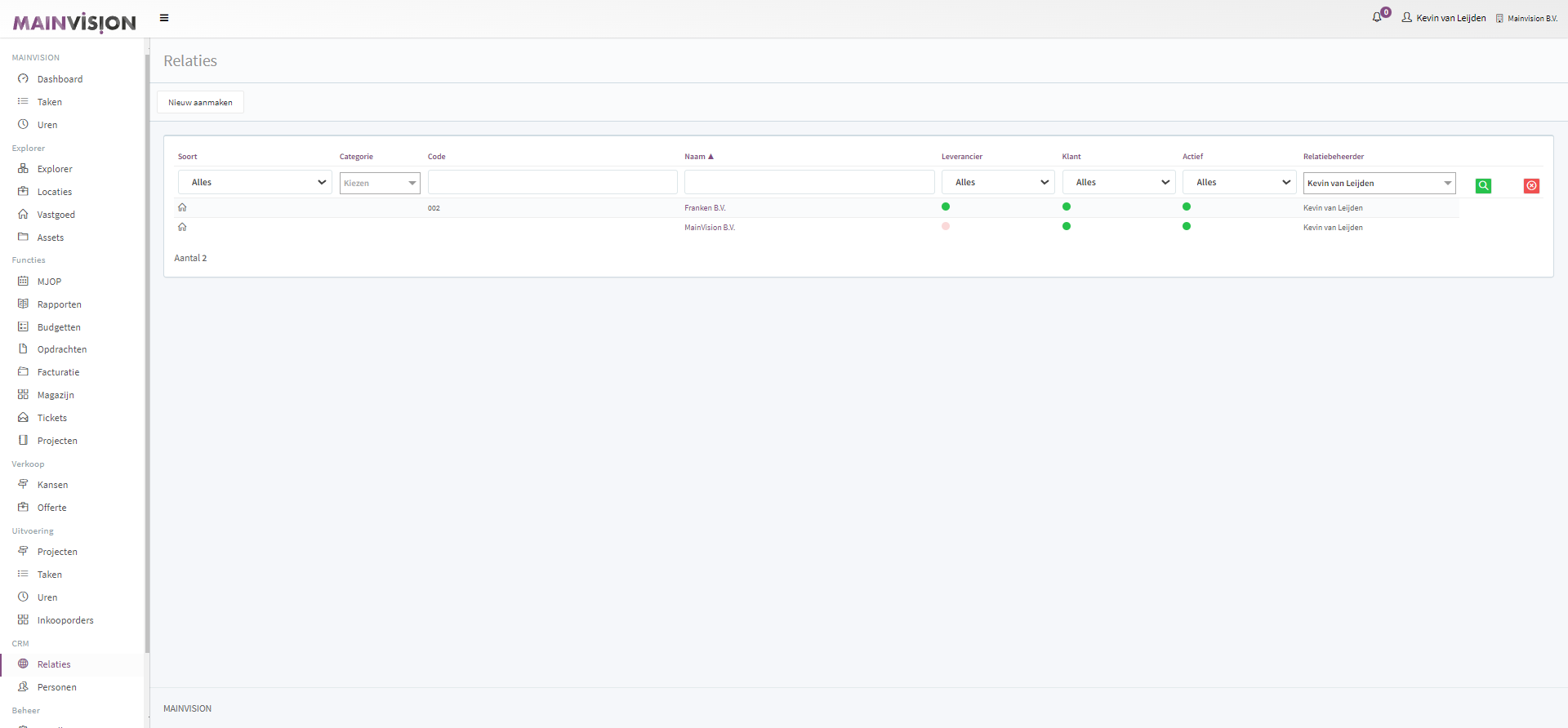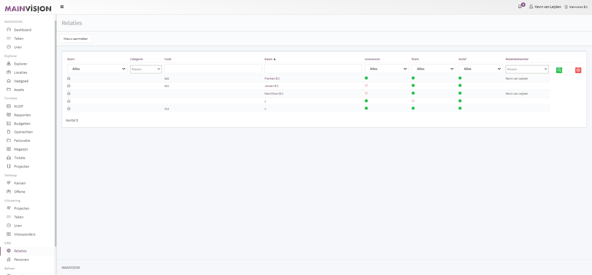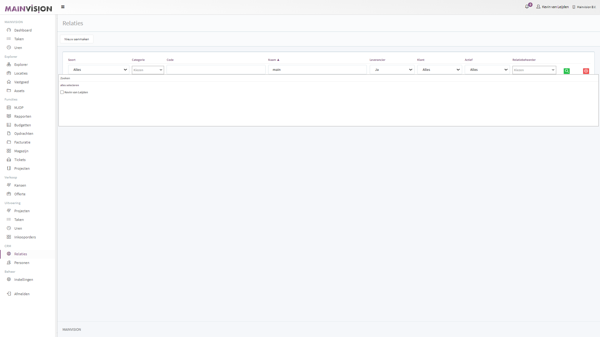 Standaard worden de relaties weergegeven die actief zijn en waar je zelf relatiebeheerder van bent. (als er geen relaties zijn waar je beheerder van bent zie je alle actieve relaties binnen je organisatie).