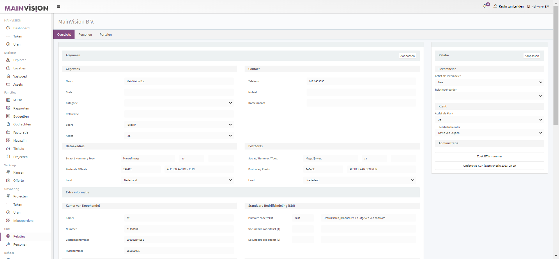 Klik op de naam van een relatie om deze te openen en de details te bekijken. Je ziet hier de informatie die van deze relatie is ingevuld. Om deze informatie te wijzigen of aan te vullen, klik Hier