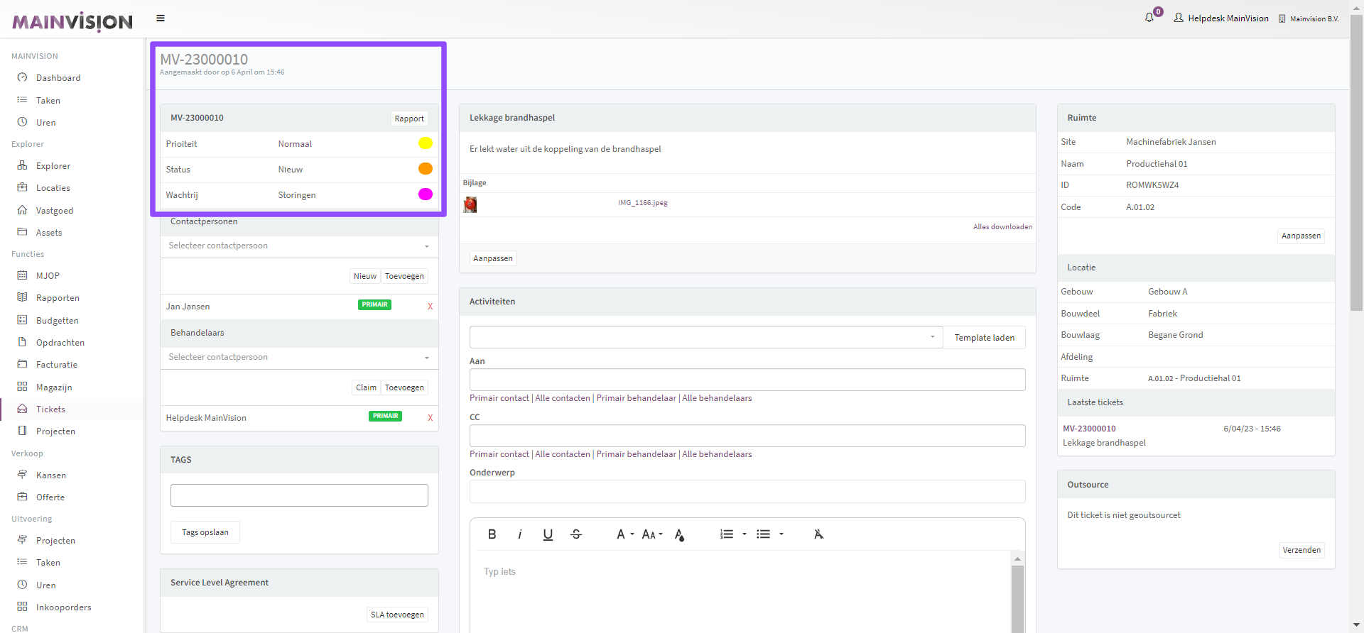 Daaronder zie je de huidige prioriteit, status en wachtrij van dit ticket.