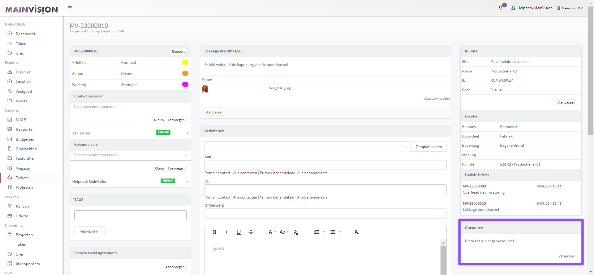Om vanuit het ticket een werkbon te versturen aan een leverancier klik je bij Outsource op Verzenden.