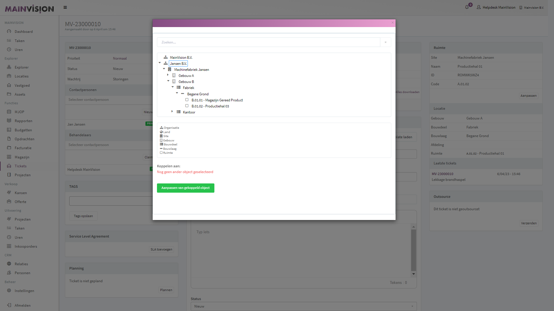 Als je op de knop “Aanpassen” klikt opent een pop-up waarbij je in de assetboom kunt zoeken naar een object waar je dit ticket aan wilt koppelen.