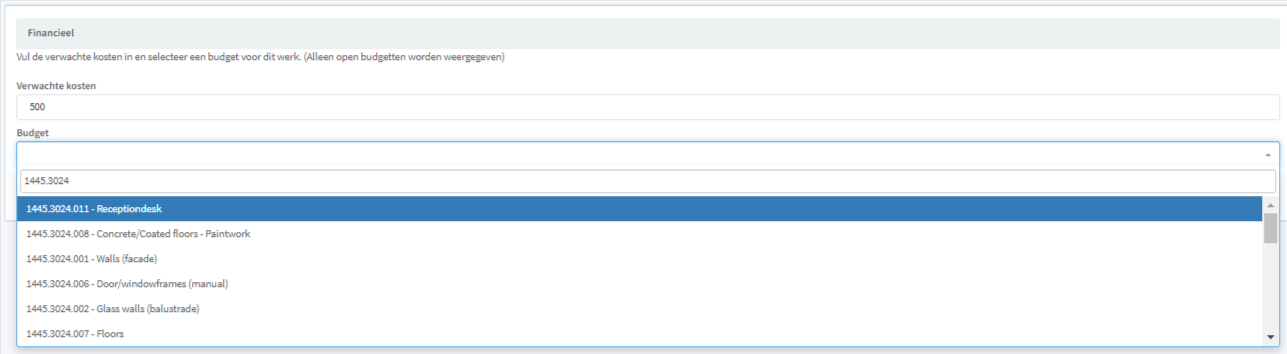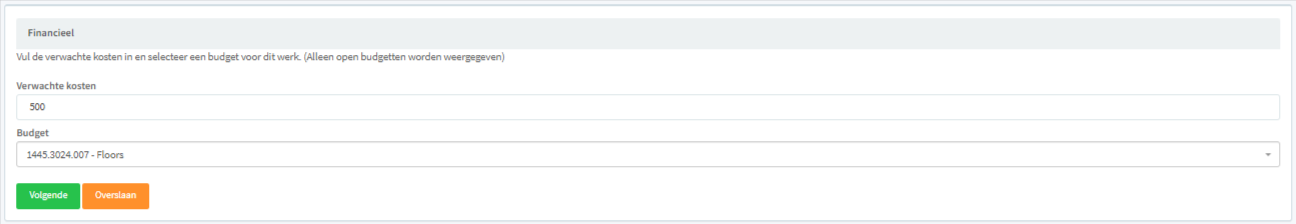 Vul de verwachte kosten in voor de werkzaamheden van deze outsource en kies het budget om de financiële verplichting aan te maken.