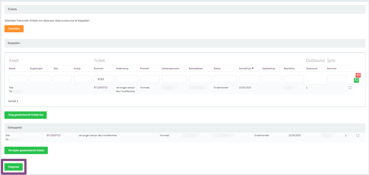 Heb je de tickets die je aan deze outsource wilt koppelen juist geselecteerd? Klik dan op de knop “Volgende”