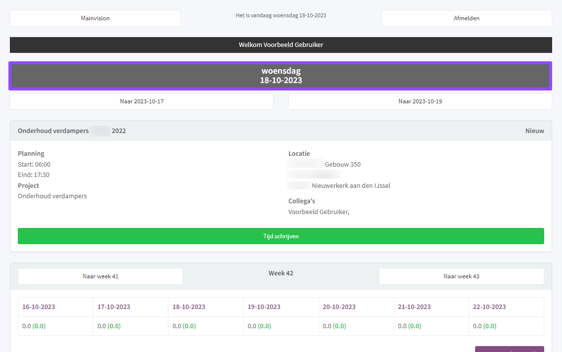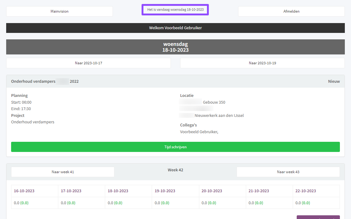 In de grijze balk staat de dag en de datum van de dag die op dit moment geselecteerd is om tijd op te schrijven. Standaard opent deze op de dag en datum van vandaag bij inloggen.