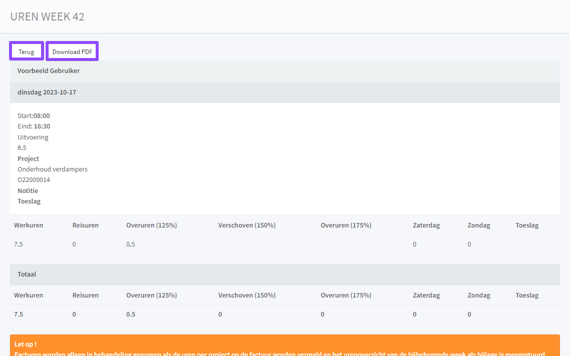 LET OP! Eventuele toeslagen,toeslagregels, pauzes en andere bijzondere verrekeningen die binnen je organisatie van toepassing zijn zijn in de urenbrief verwerkt.
