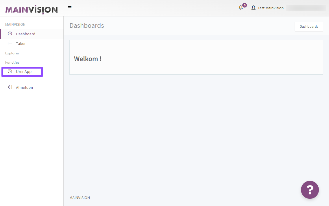 Als je toegang hebt tot andere functies van MainVision staat rechtsboven de knop "MainVision". Heb je geen toegang tot andere functies dan zie je deze knop niet. Als je op deze knop tikt open je de hoofdapplicatie.