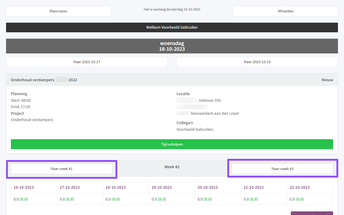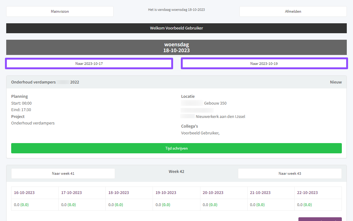 Als je een dag terug of vooruit bladert veranderd de geselecteerde dag waarop je tijd kunt schrijven in de grijze balk en de datums waarnaar je terug en vooruit kunt bladeren.